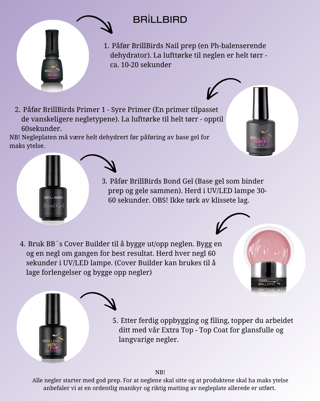 Rutinen bygger på grundig forarbeid og kombinerer ulike primer-alternativer med en stabil og slitesterk builder gel. Dette gir bedre kontroll og større fleksibilitet i møte med krevende negler, uten at du må bytte hele system eller gjette deg frem.